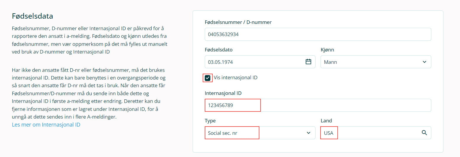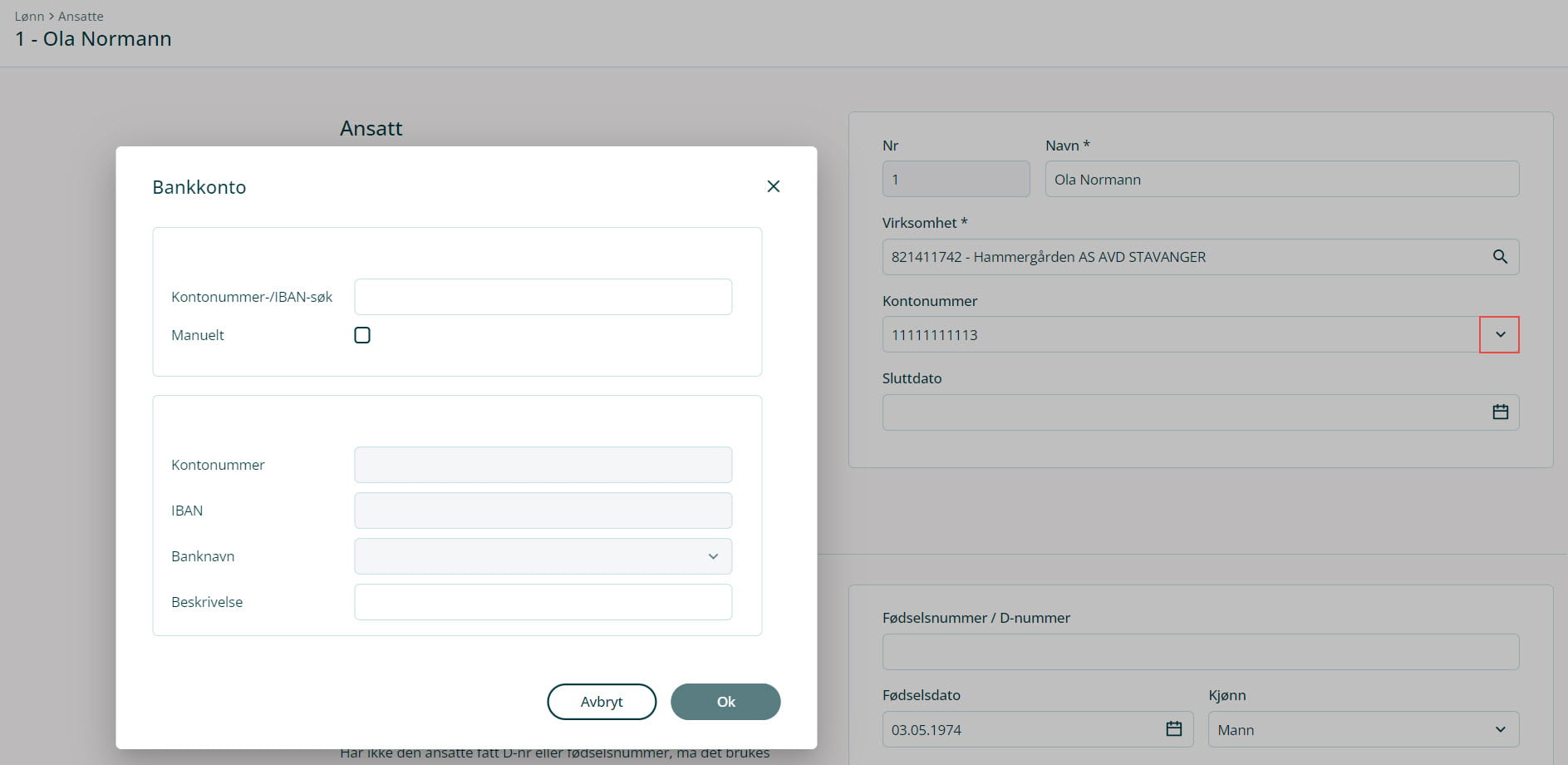 Det er mottaker av utbetalingen som er ansvarlig for å gi deg sitt IBAN-nummer. Legg inn IBAN-nummeret i feltet for bankkonto i på ansattkortet. Systemet registrerer da korrekt informasjon for å utbetale lønn til den utenlandske bankkontoen. Land som ikke opererer med IBAN kan ha andre krav til informasjon. Da vil det vanligvis være tilstrekkelig å legge inn landskode og bankkode i feltet for bankkonto, men det kan være unntak (for eksempel til banker utenfor EU hvor banken ikke har BIC). Utbetalingen gjøres i NOK.