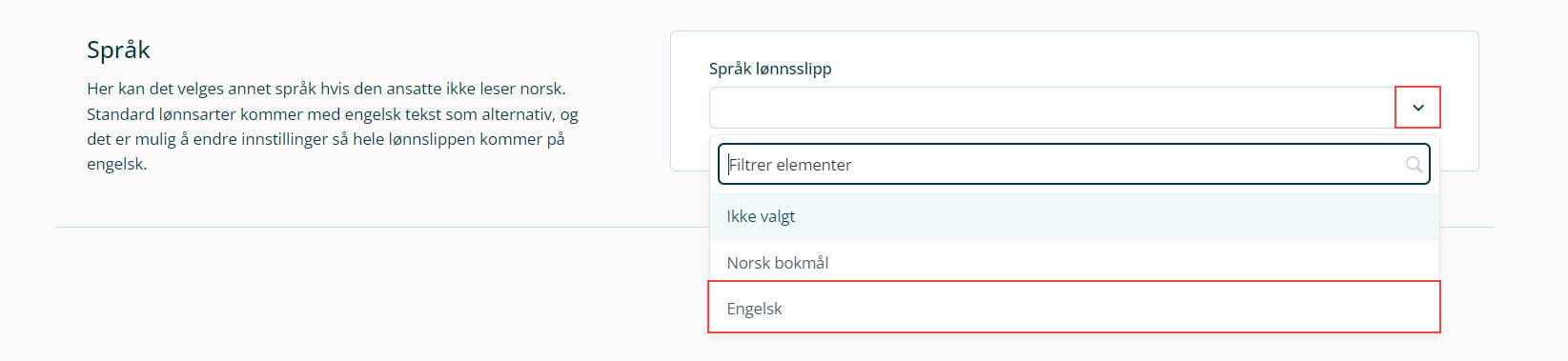 Klikk på pilen for å endre språk til engelsk på lønnsslipp for hver ansatt. Dersom feltet står tomt vil systemet automatisk generere lønnsslipp på norsk.