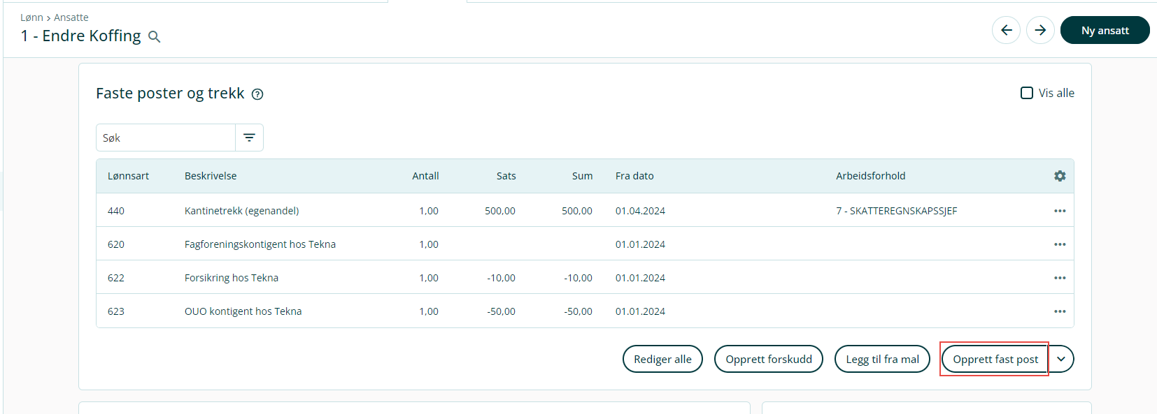 Slik oppretter du faste poster på én ansatt