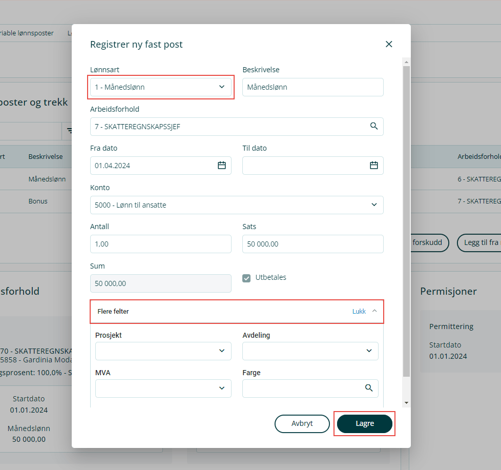 NB: Merk at fastlønn vil avkortes relativt til perioden for lønnsavregning. Dersom det for eksempel skal utbetales lønn for oktober og en ansatt legges opp med fastlønnspost som starter 15. oktober, vil systemet automatisk legge opp en utbetaling på ca. 50 % av fastlønnen. |