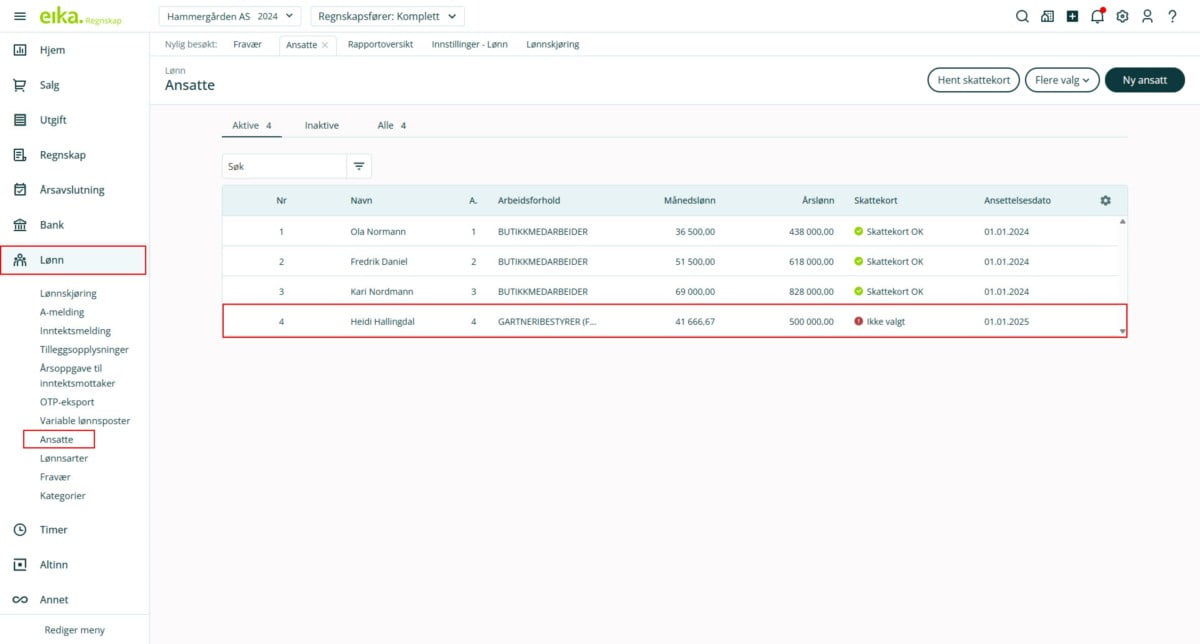 1. Gå til Lønn i venstremenyen og velg Ansatte. Klikk på den ansatte du ønsker å legge inn reskontro på.