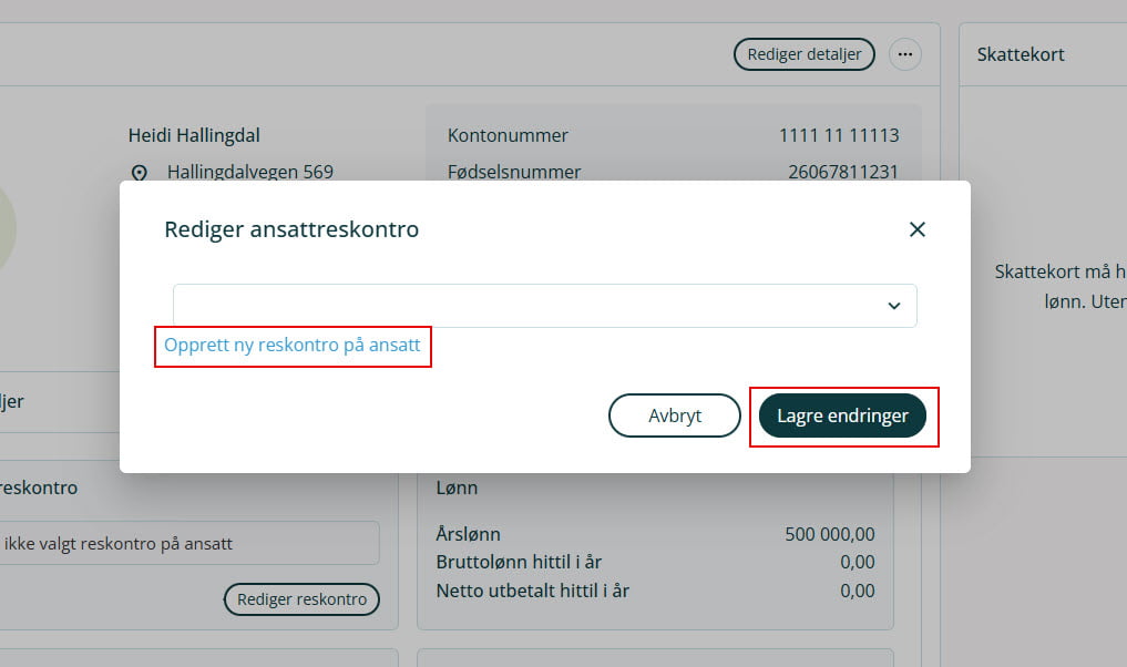 3. Legg inn tidligere ansattreskontroer ved bruk av nedtrekkslisten, eller klikk på Opprett ny reskontro på ansatt. Husk å klikke på Lagre endringer.