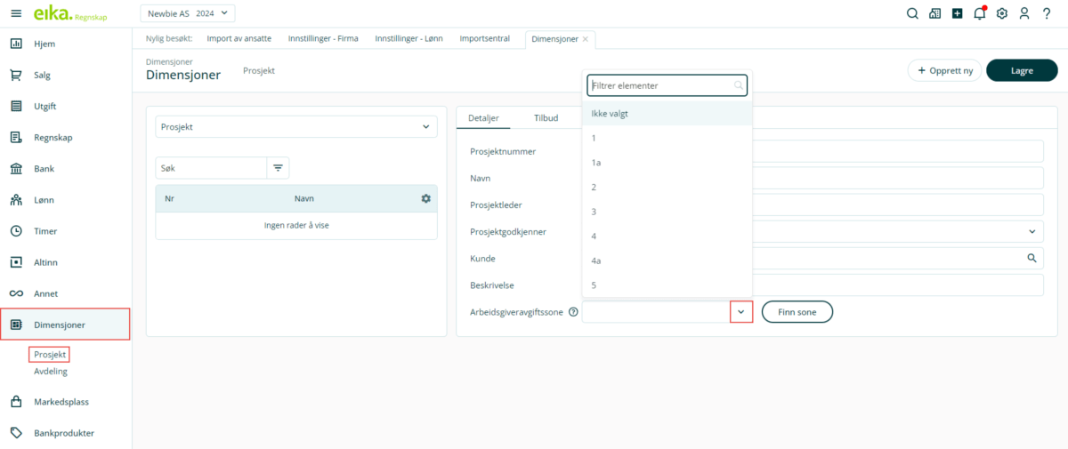 1. Gå til Dimensjoner i venstremenyen og velg Prosjekt. Opprett ny dimensjon ved behov og klikk på pilen for å velge Arbeidsgiveravgiftsone.Føre lønnspostermot aga-sone direkte i lønnsavregning