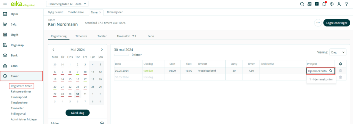 Føre arbeidstimer mot prosjekt der dimensjonen prosjekt er styrt mot en aga-sone