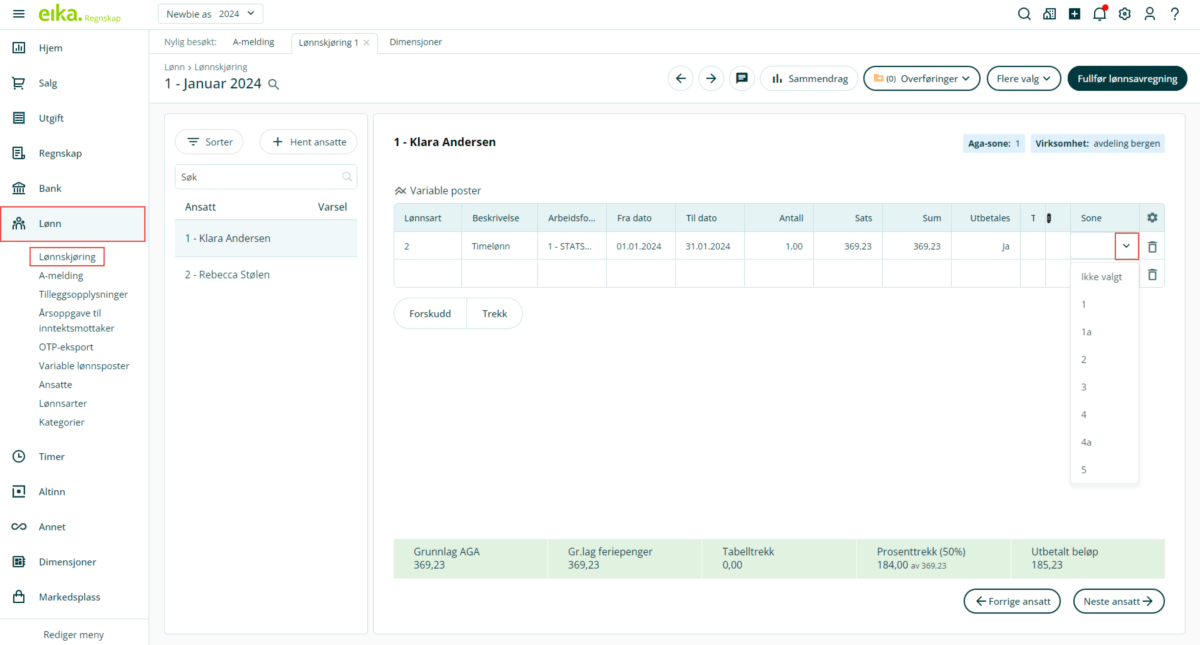 3. Fyll ut soner direkte på lønnspostene. Lønnsposter som føres uten sone vil beregnes ut ifra den sonen som er registrert på selskapet under lønnsinnstillinger juridisk enhet.