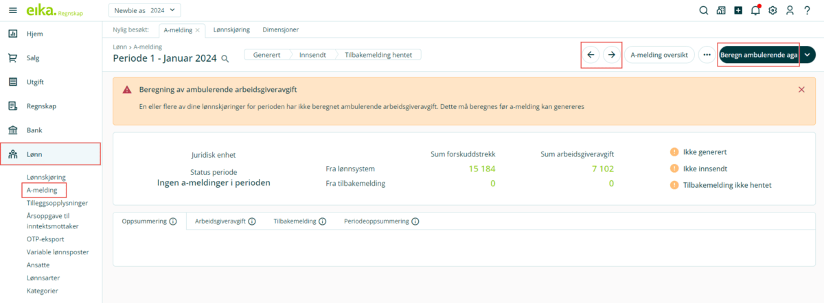 6. Klikk på pilene for å navigere til den perioden du skal sende A-melding på og klikk på Beregn ambulerende aga.