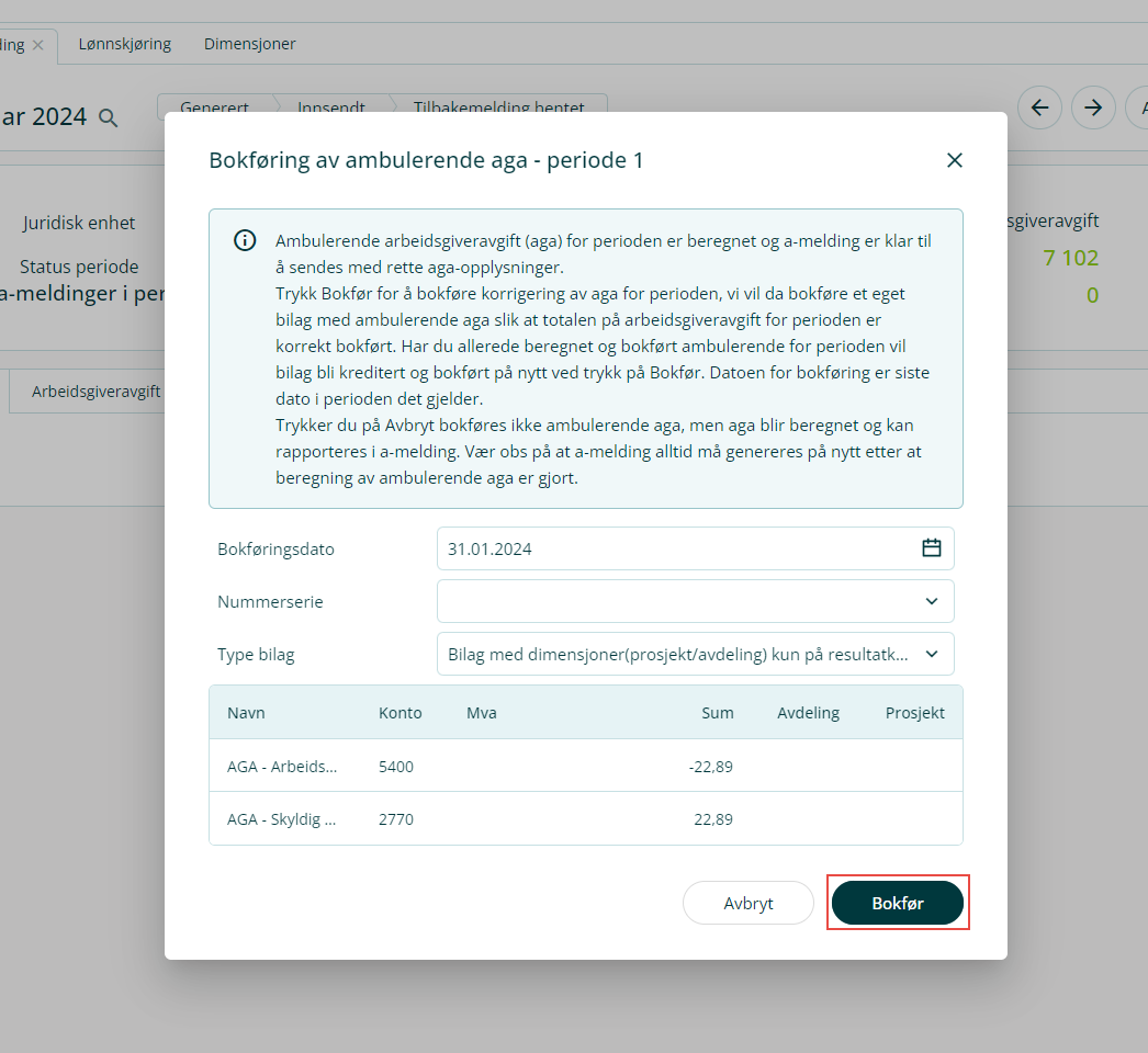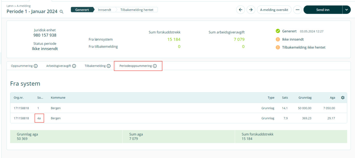 Etter bokføring og generering av A-meldingen kan man finne igjen detaljer om arbeidsgiveravgift ved å klikke på fanen Arbeidsgiveravgift. Sum og grunnlag finner du ved å klikke på Periodeoppsummering.