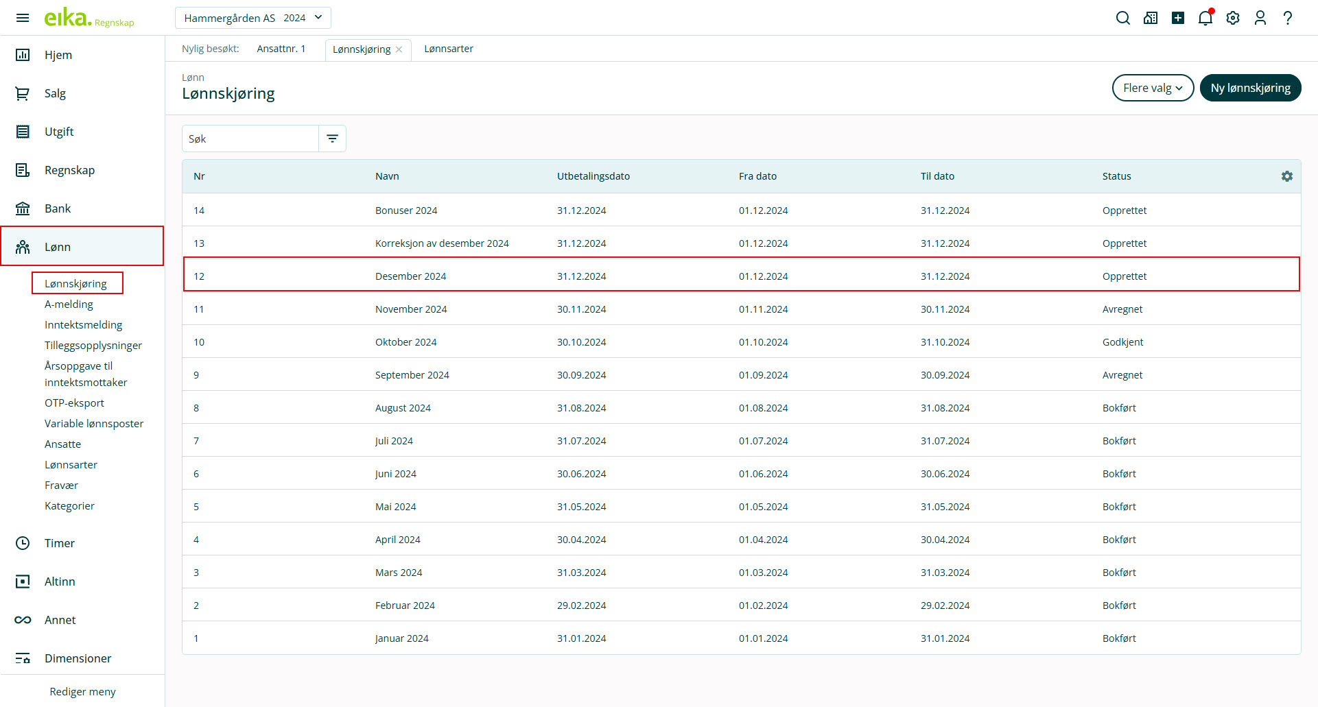 1. Gå til Lønn i venstremenyen og velg Lønnskjøring. Klikk på en lønnskjøring du ønsker å postere lønnsposter for etterbetaling av lønn.