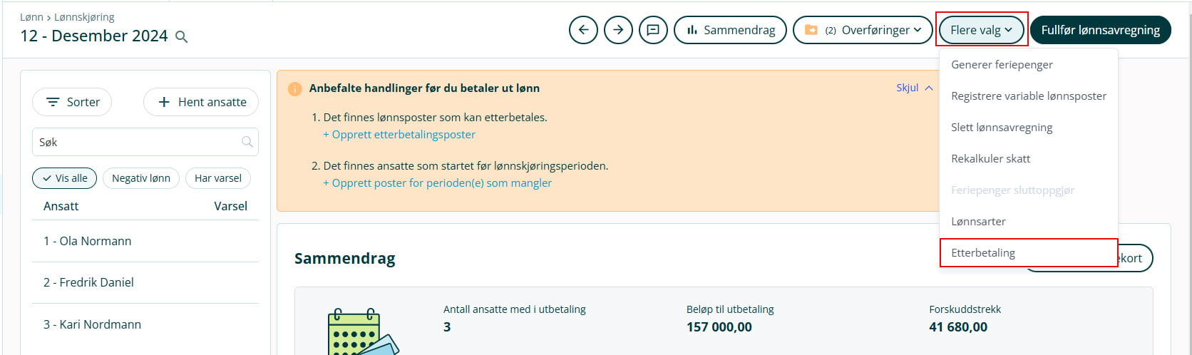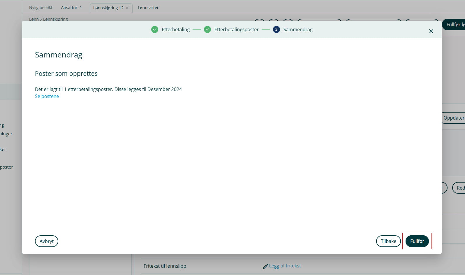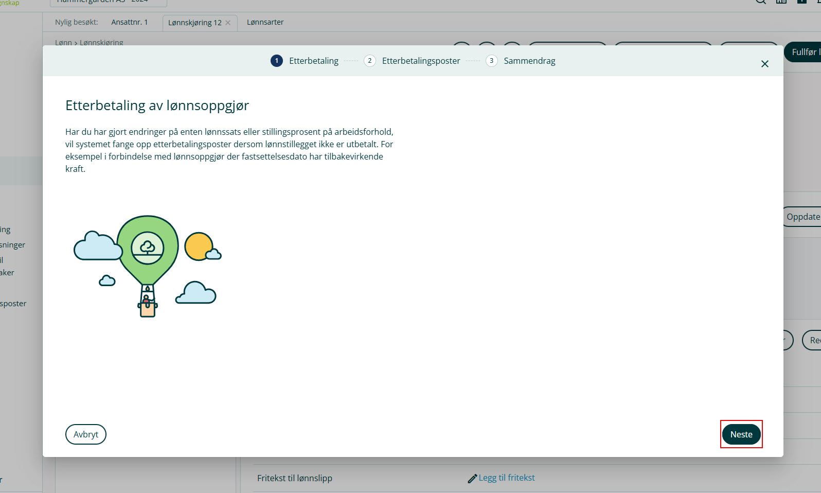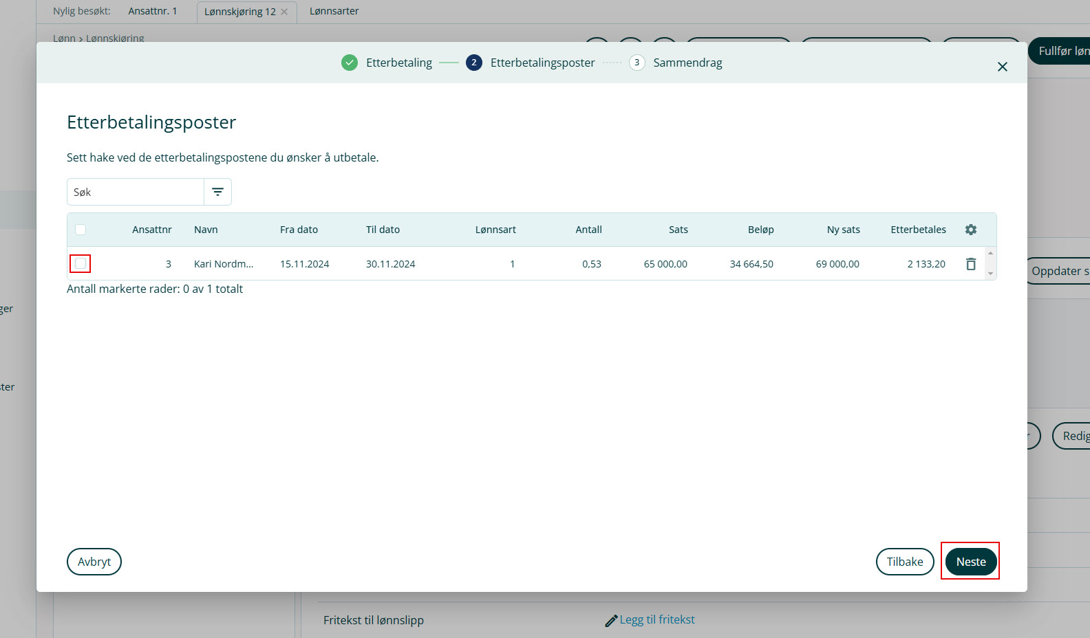 Har du har gjort endringer på enten lønnssats eller stillingsprosent på arbeidsforhold, vil systemet fange opp etterbetalingsposter dersom lønnstillegget ikke er utbetalt. For eksempel i forbindelse med lønnsoppgjør der fastsettelsesdato har tilbakevirkende kraft.