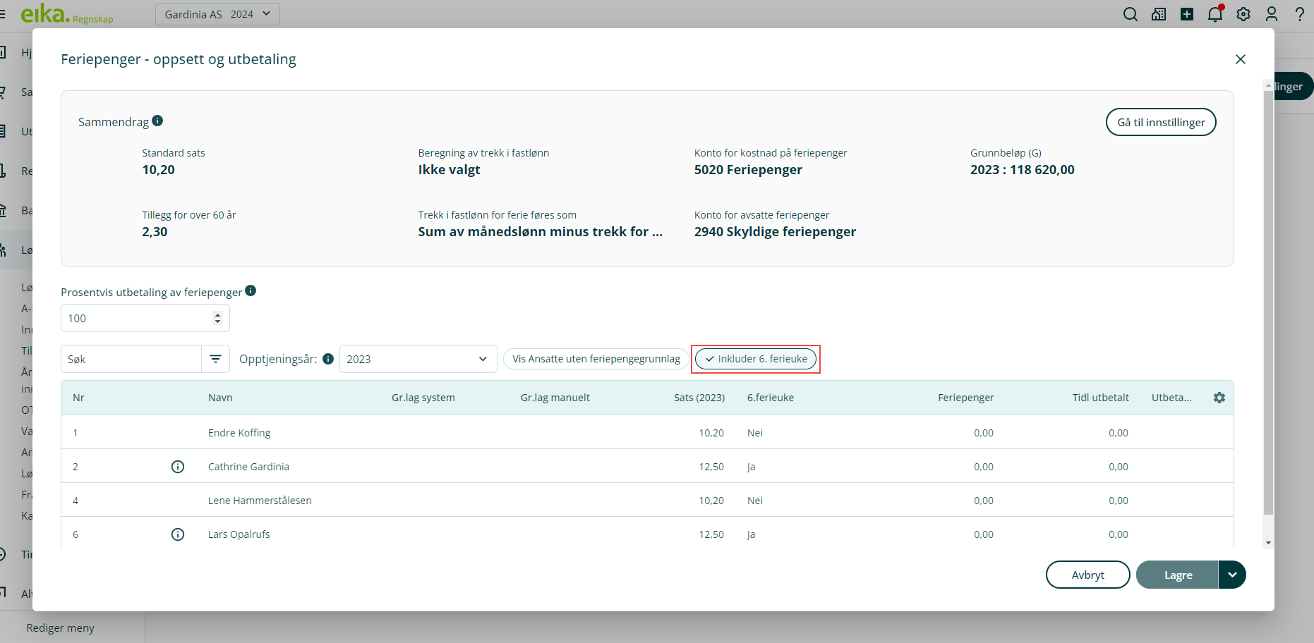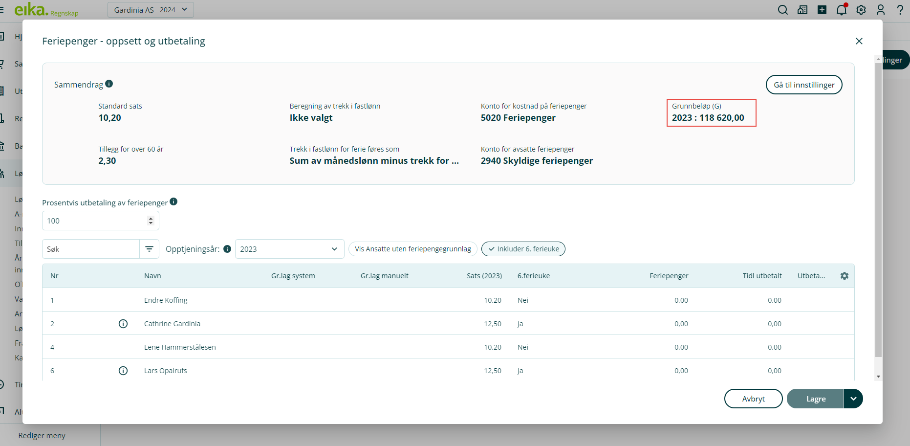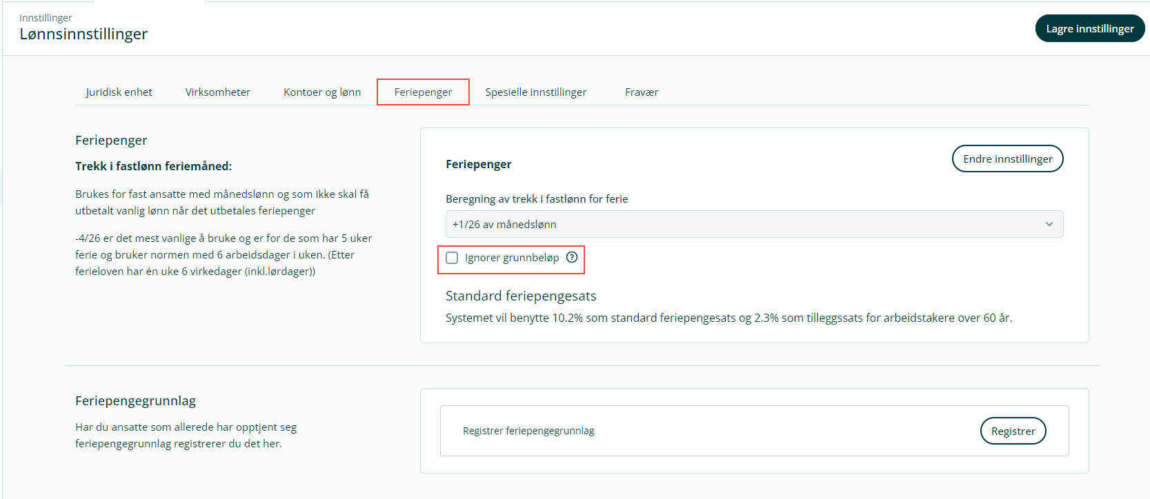 Ved å sette hake ved ☑ Ignorer grunnbeløpet under Lønnsinnstillinger, vil systemet beregne hele feriepengegrunnlaget med selskapets standardsats, og ekstra 2,3 % for ansatte over 60 år og med feriepengegrunnlag over 6G.
