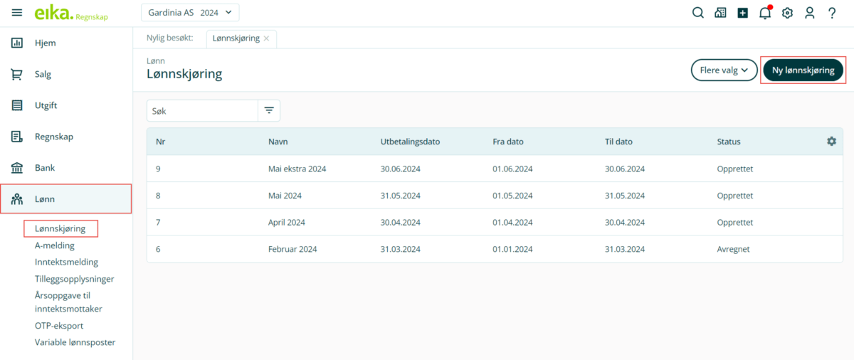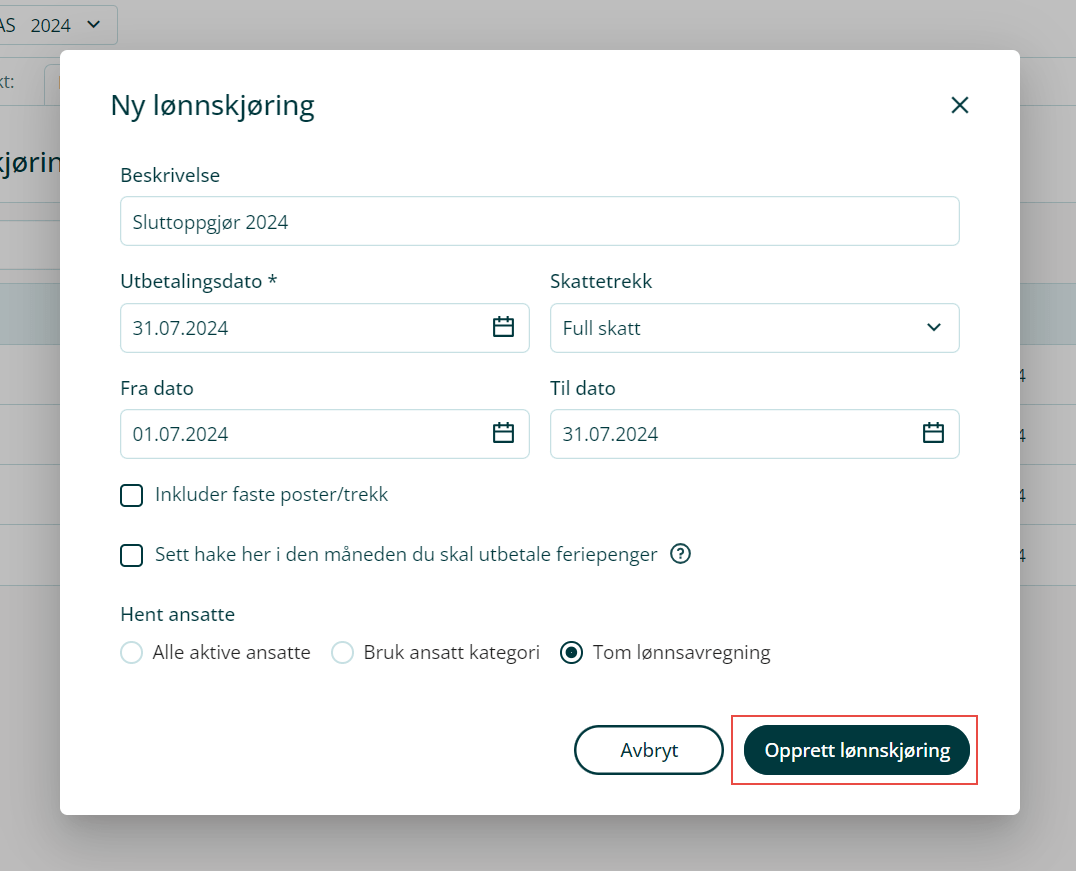 2. Fyll ut feltene og klikk Opprett lønnsavregning. I eksempelet under har vises en tom lønnsavregning, men dette er valgfritt.