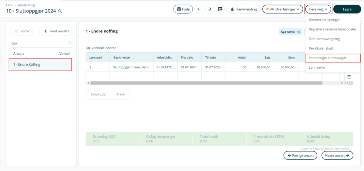 4. Klikk på Flere valg og velg Feriepenger sluttoppgjør.