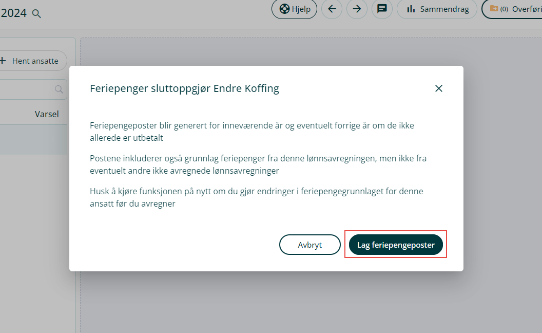 5. Klikk på Lag Feriepengeposter.