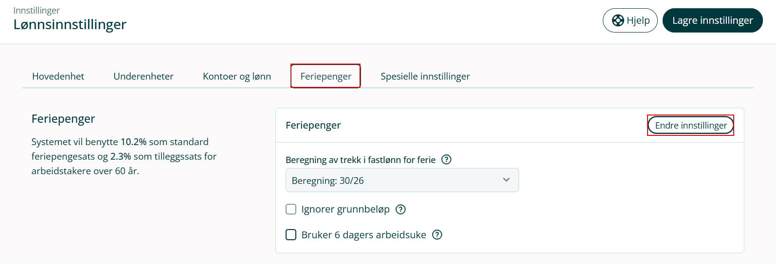 Ferielovens minstekrav er trekk ved beregningen 25/26: 6 dagers arbeidsuke. Bruk med sats: 10,2 %, ferie: 4 uker + 1 dag