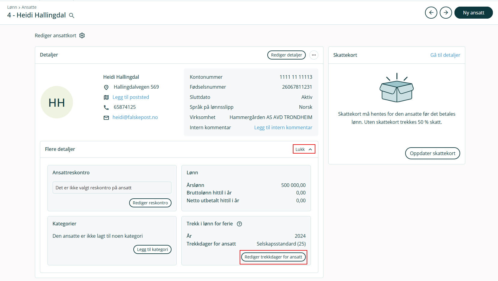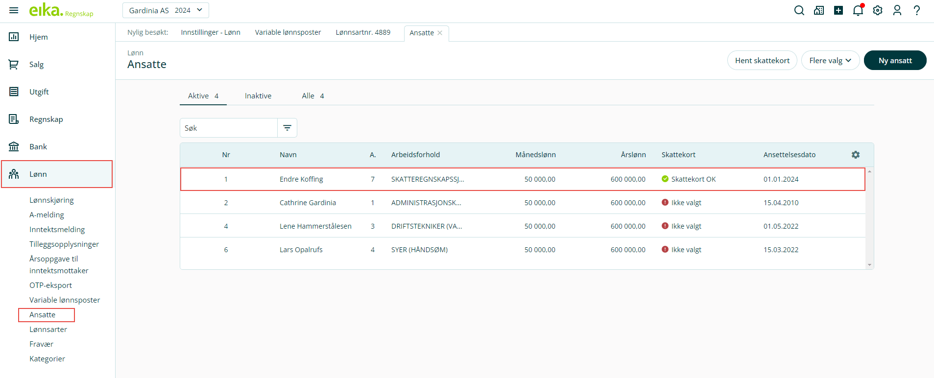 1. Gå til Lønn i venstremenyen og velg Ansatt. Klikk aktuell ansatt.