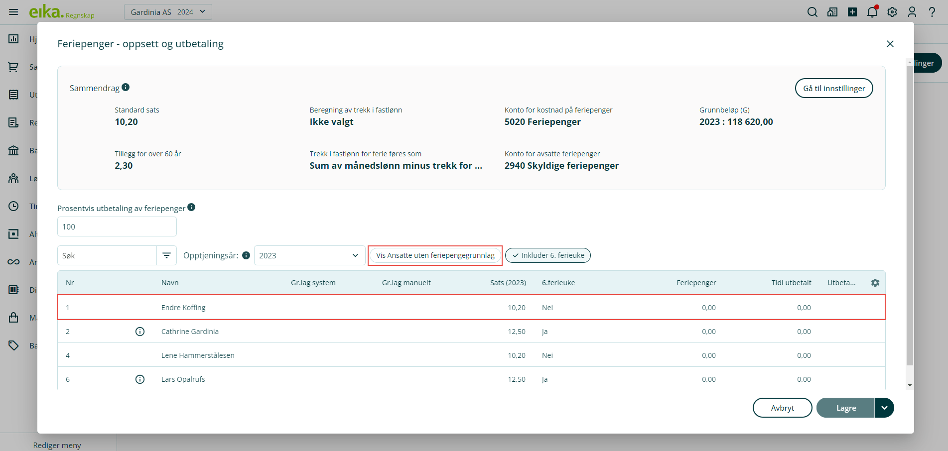 Gå til Lønn i venstremenyen og velg Lønnsarter. Hvis det er det satt hake ved ☑ Med i grunnlag for: Feriepenger vil systemet beregne feriepengegrunnlag av lønnsarter.