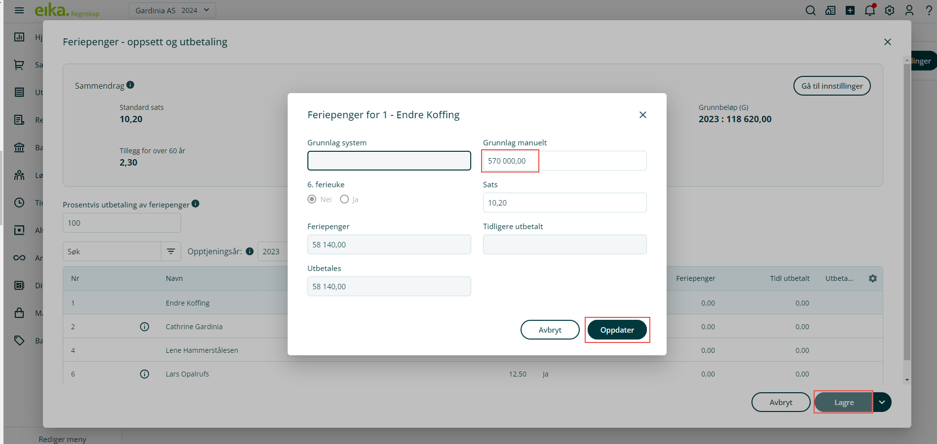 Dersom du ønsker å manuelt endre feriepengesats per ansatt, kan dette gjøres her. Vær oppmerksom på at dette vil overstyre standard feriepengesats for selskapet, men ikke feriepengetillegget for ansatte over 60 år. Du kan nullstille feriepengesats til selskapets standard i ettertid5. Klikk på Lagre