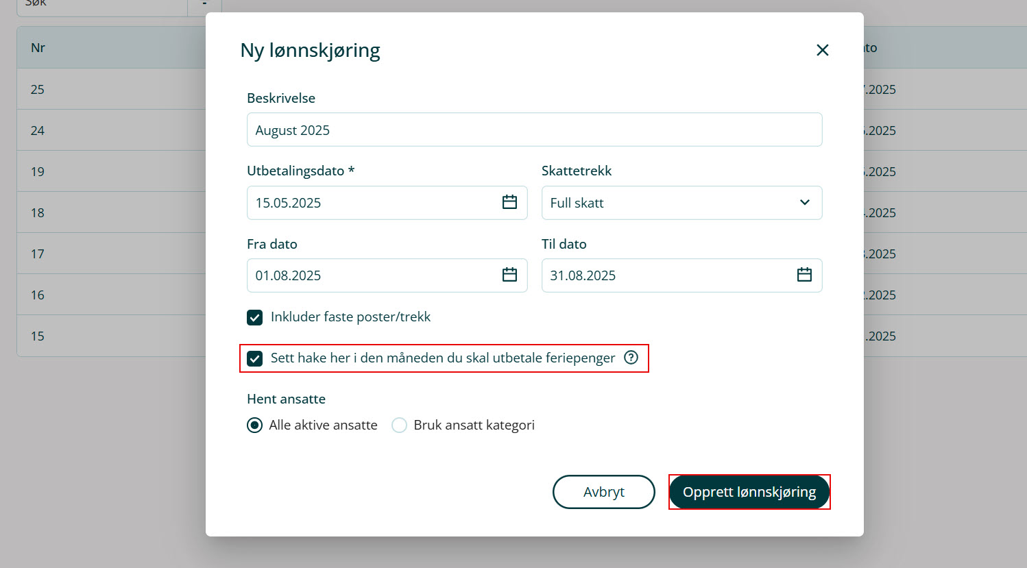 NB! Ved å sette hake ved punktet ☑ Sett hake her i den måneden du skal utbetale feriepenger, vil systemet automatisk omgjøre lønnposter som er kategorisert som fastlønn (månedslønn osv.) til korrekt kalkulert trekk i fastlønn for ferie etter det som er bestemt for selskapet i lønnsinnstillingene.