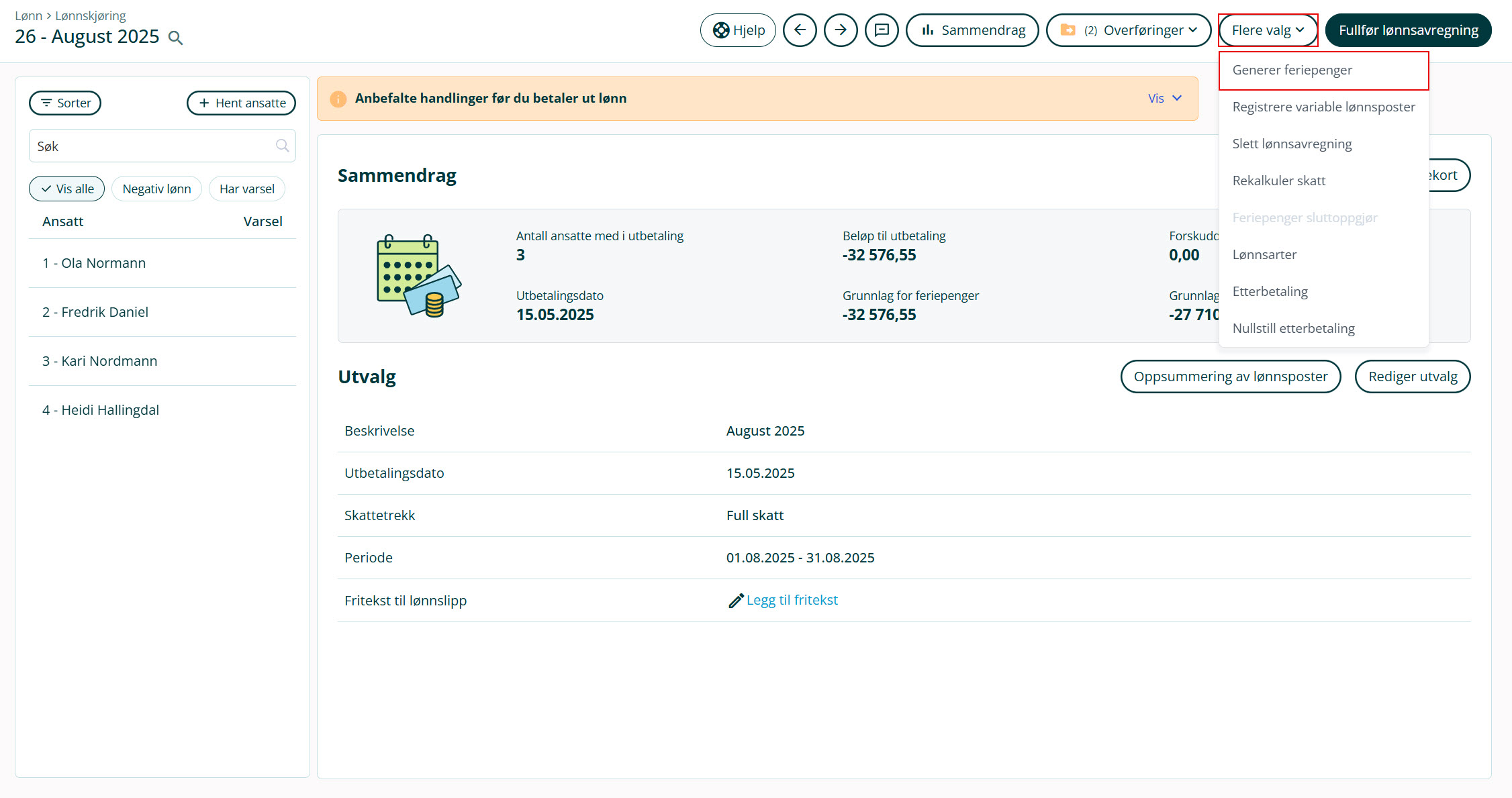 - Kolonnen for Utbetales viser hvor mye som kan utbetales til hver ansatt. Du kan overstyre beløpet hvis kun deler av feriepengene skal utbetales.