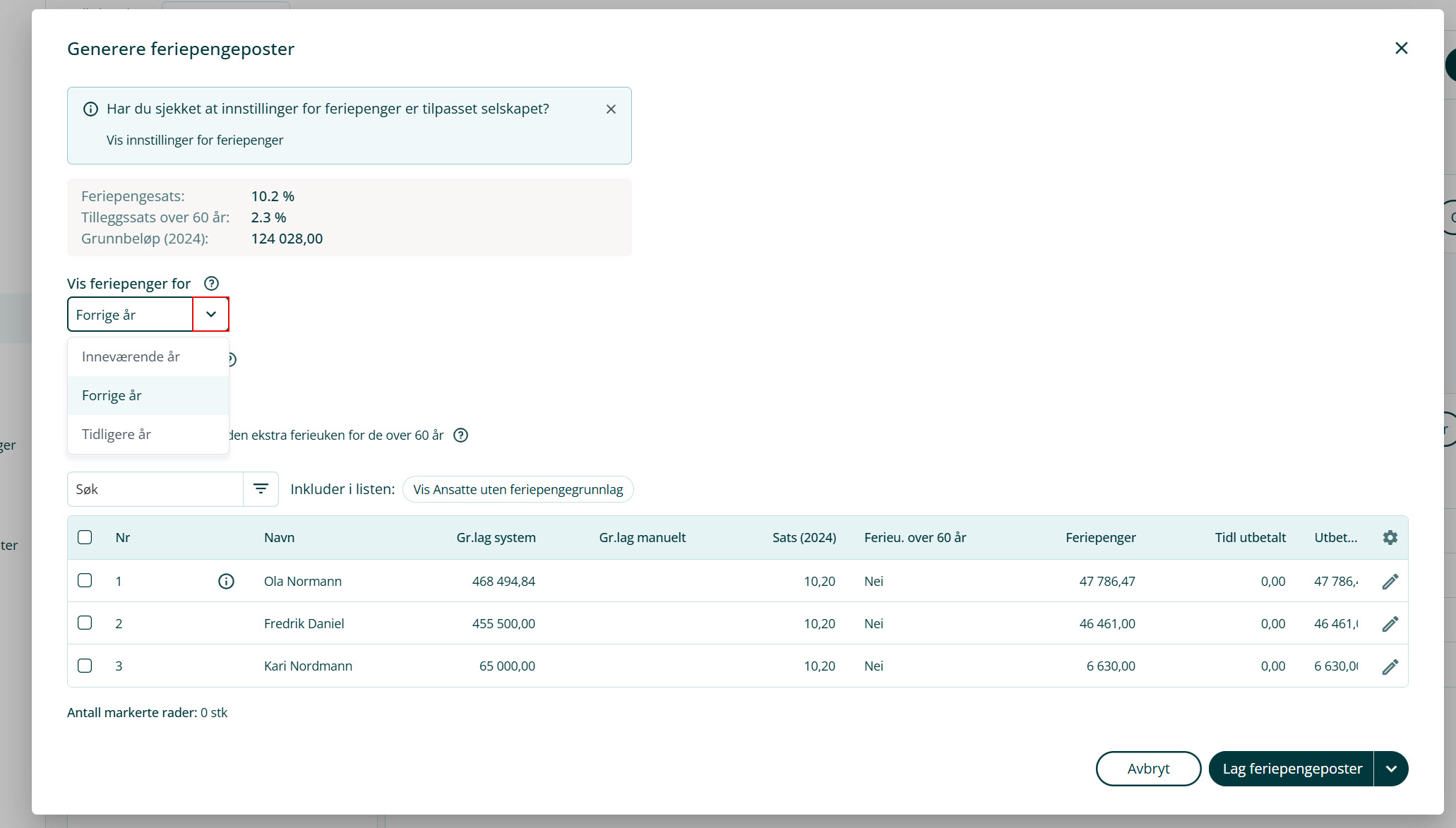 5. Sett hake ved ☑ de ansatte du skal utbetale feriepenger for, og klikk på Lag feriepengeposter.