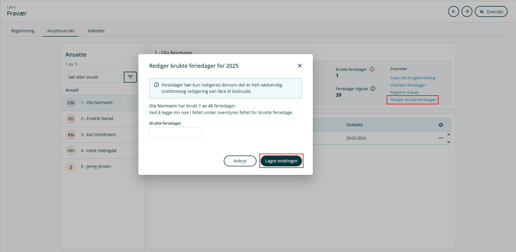 4. Du kan enten endre datoer og klikke på Lagre, eller velge Slett fravær.