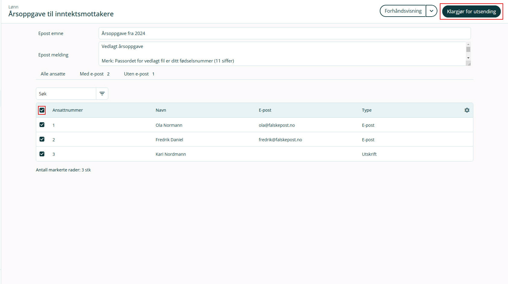 3. Sett hake ved ☑ aktuelle ansatte (sett hake ved ☑ Ansattnummer for å velge alle ansatte).
