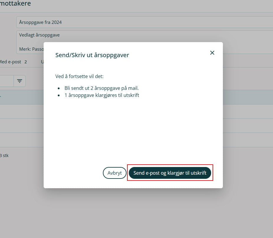 Dersom det finnes ansatte som ikke har e-postadresse definert i ansattkortet, vil systemet foreslå å skrive ut årsoppgaven for disse.