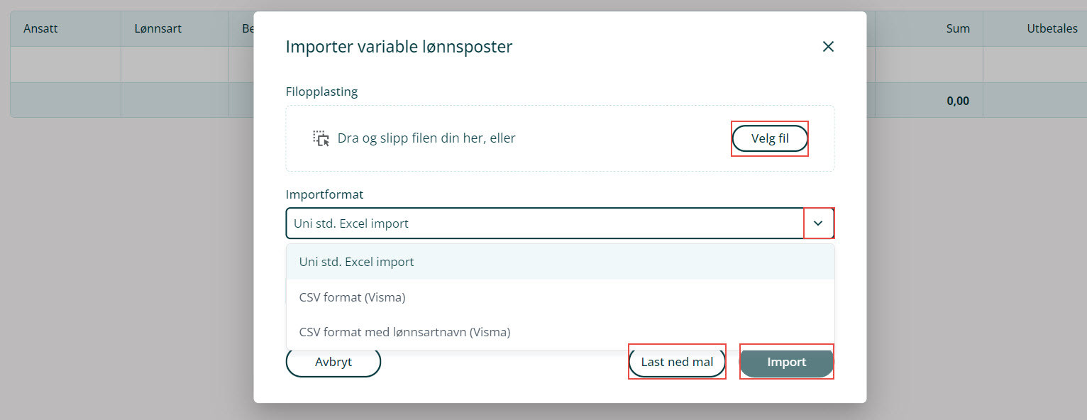6. Klikk på Velg fil for å laste opp ferdig utfylt mal. Klikk på Import for å importere variable lønnsposter.