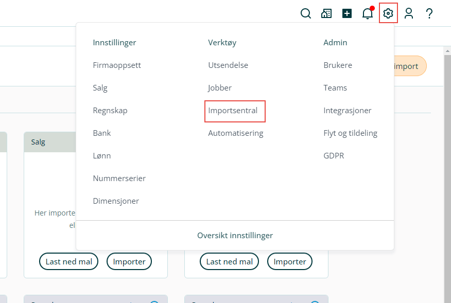 1. Gå til ⚙ Innstillinger i toppmenyen og velg Importsentral.