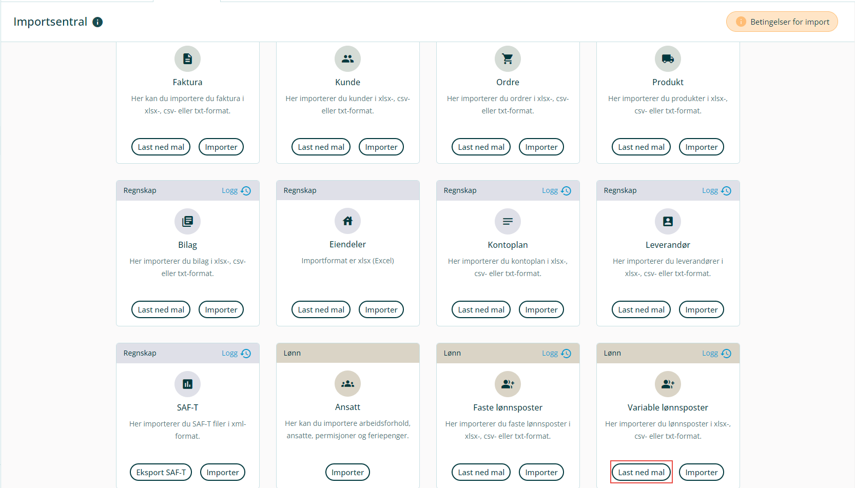2. Gå til fanen Import og klikk på Last ned mal under Variable lønnsposter.