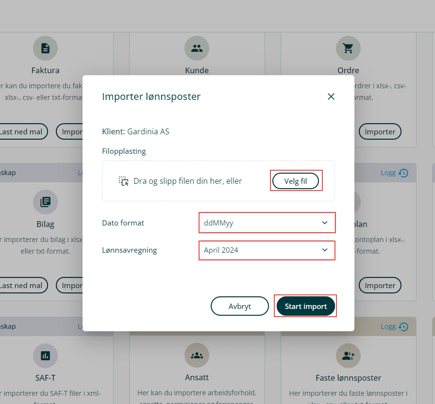 4. Klikk på Importer under Variable lønnsposter. Klikk deretter på Velg fil for å laste opp ferdig utfylt mal. Sett aktuelt datoformat og velg aktuell lønnsavregning. Klikk på Start Import for å importere variable lønnsposter.