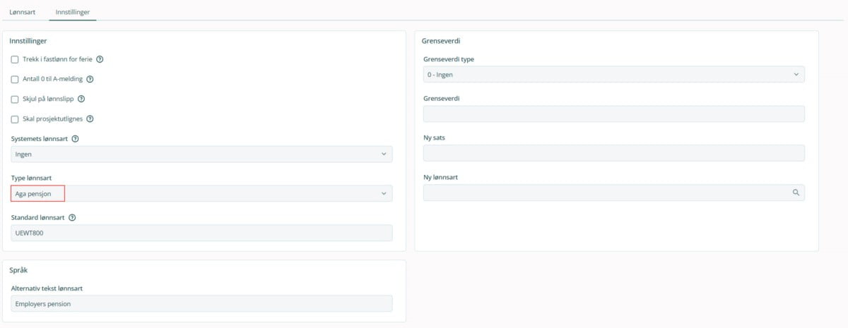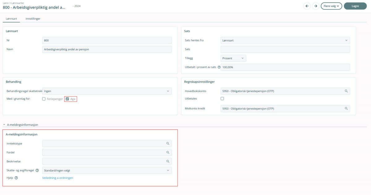 Som systemets standard lønnsart ligger 800 Arbeidsgiverpliktig andel av pensjon. Denne kan du benytte for å innberette arbeidsgiverpliktig andel av pensjon (OTP). Lønnsarter for innberetning av arbeidsgiverpliktig andel av pensjon skal ikke ha utfylt informasjon under A-meldingen, og haken for AGA skal være på.