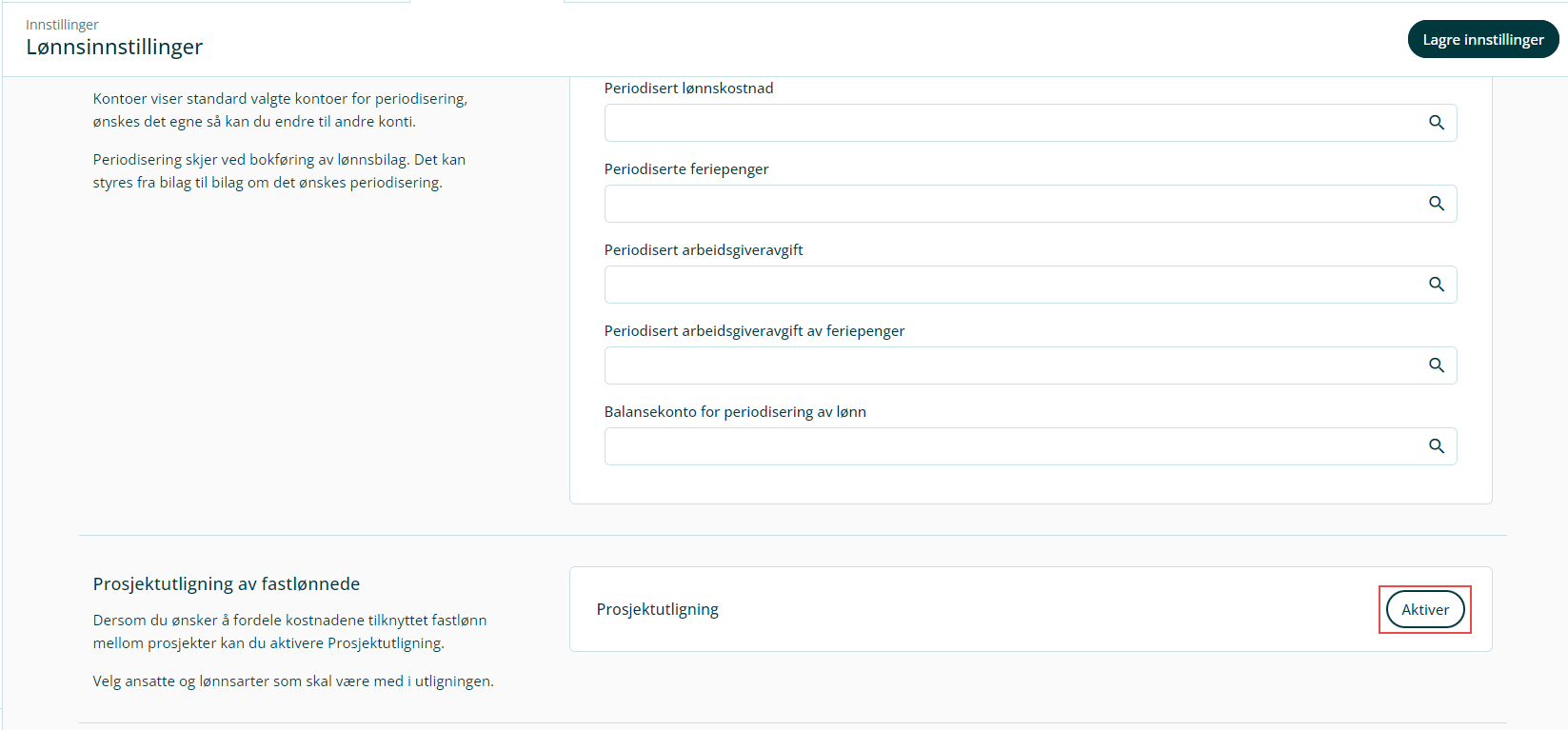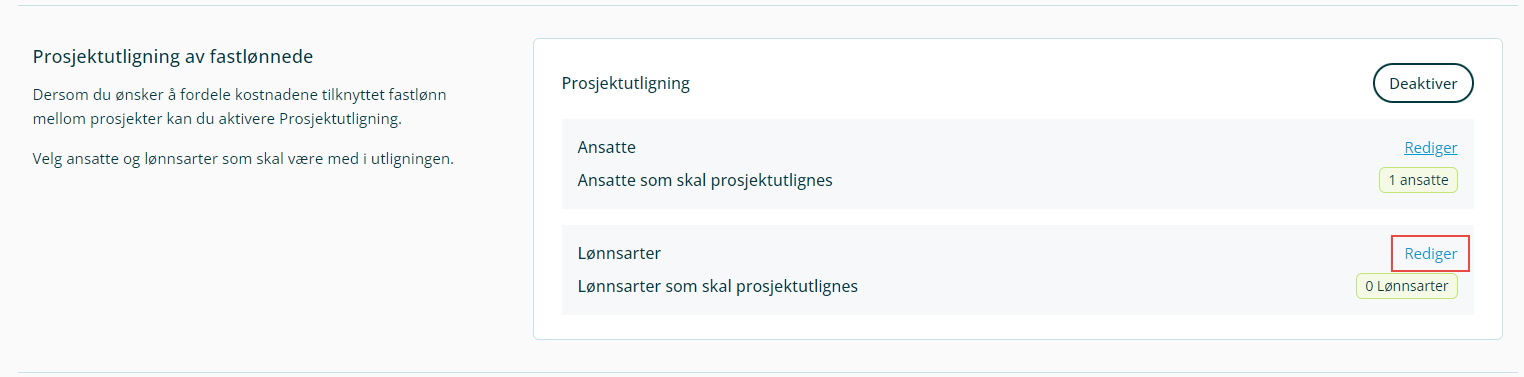 Her kan du legge inn de lønnsartene at systemet skal utligne. Systemet vil da kostnadsføre lønnen per prosjekt, men den ansatte vil få fastlønn på sin lønnshistorikk.