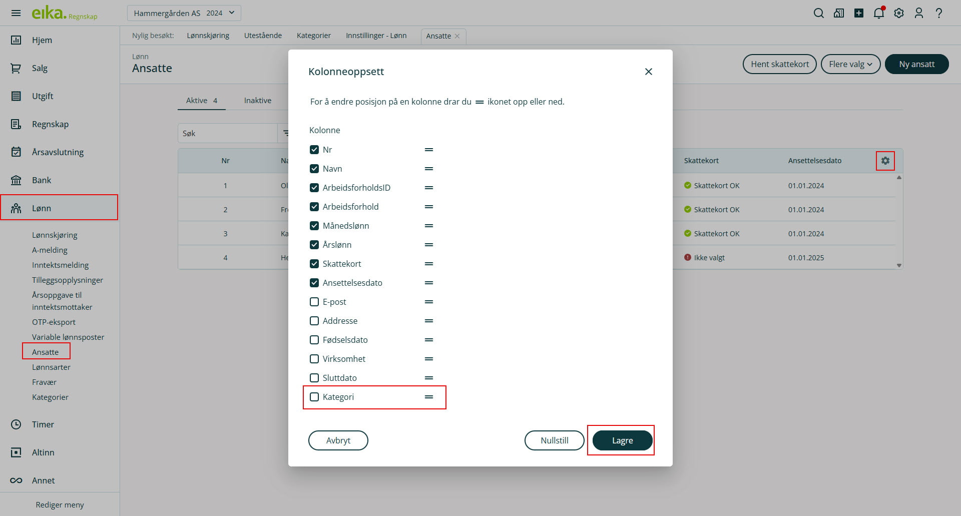 2. Gå til kategorien Lønn og klikk på Ansatte. Velg en kategori fra ▾ nedtrekkslisten for å få en visning av alle ansatte i gitt kategori, eller klikk på kolonnevelgeren til høyre for å hente frem kolonnen Kategorier.
