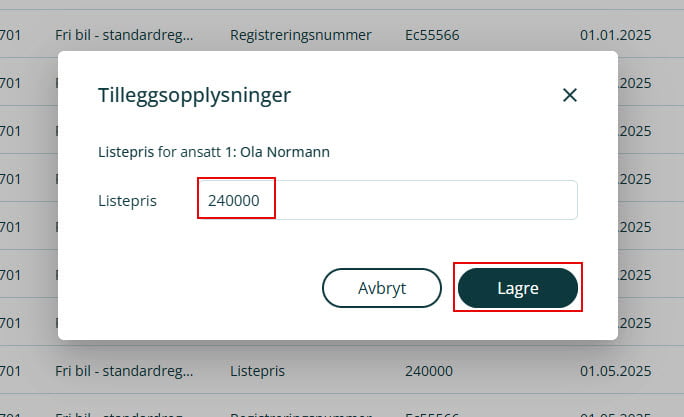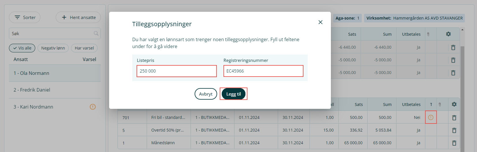 3. Klikk på utropstegnet (!) på lønnsposten, skriv inn verdiene og klikk Legg til.