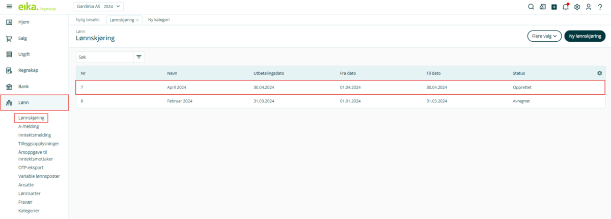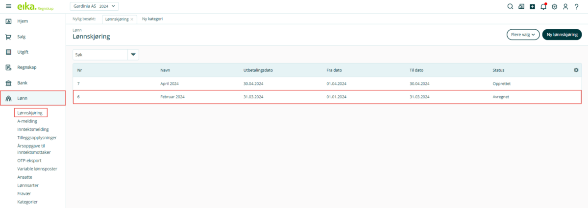 1. Gå til Lønn i venstremenyen og velg Lønnskjøring. Velg aktuell opprettet lønnskjøring.