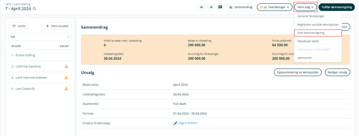 NB! Det er ikke er mulig å gjenopprette en slettet lønnskjøring. Dersom en lønnsavregning tidligere har vært avregnet, og sendt i en A-melding, er det ikke mulig å slette den.