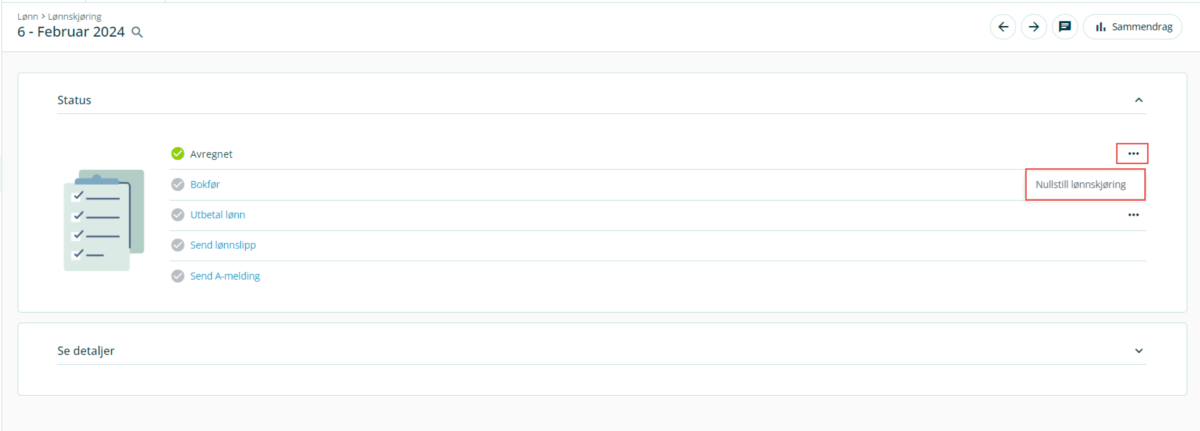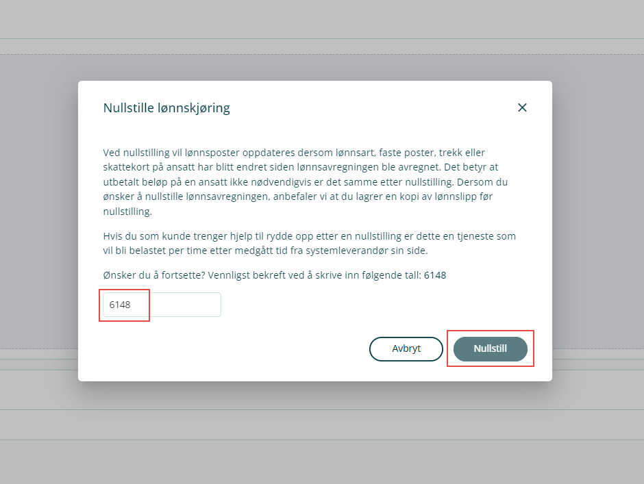 Før du nullstiller en lønnskjøring anbefaler vi å innhente lønnslipper, konteringssammendrag og lønnsposter fra oversiktsvinduet. Dette er fordi en nullstilling vil oppdatere lønnskjøringen med siste endring av faste poster, lønnsarter og skattetrekk på de ansatte hvis det er gjort endringer.