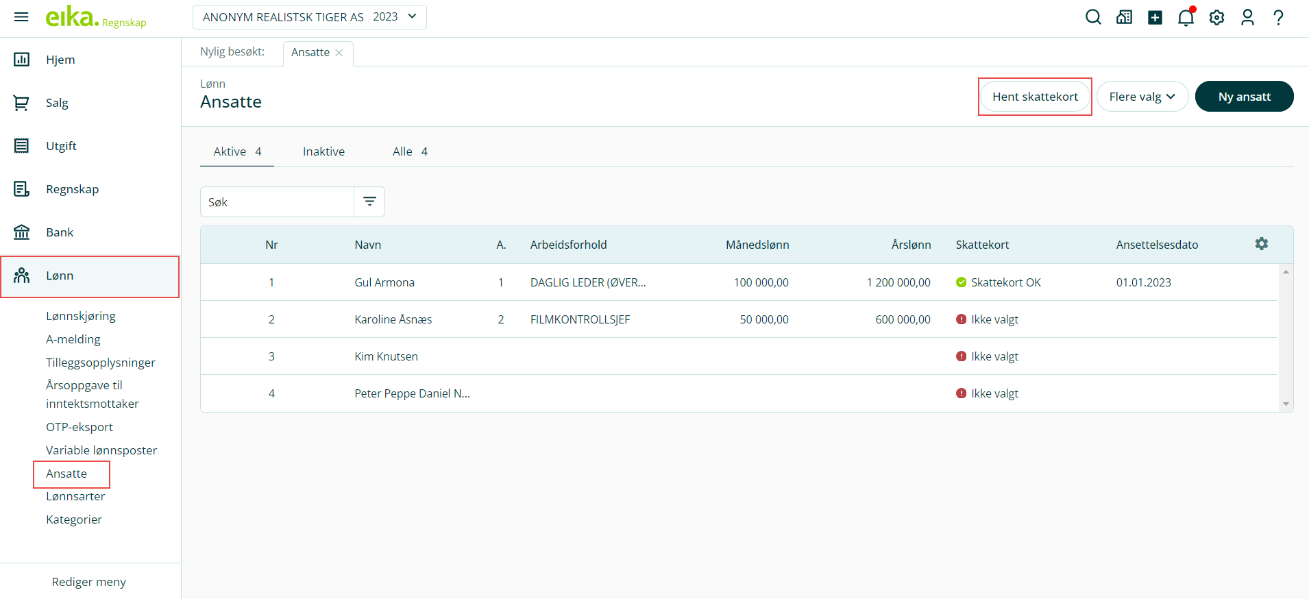 1. Gå til Lønn i venstremenyen og velg Ansatte. Klikk på Hent skattekort.