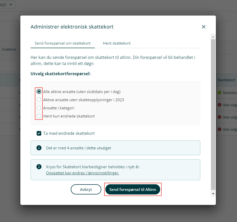 - Alle aktive ansatte (uten sluttdato per i dag): Alle ansatte som ikke har en sluttdato, inkludert tilfeller hvor det allerede er blitt innhentet skattekort samme år.