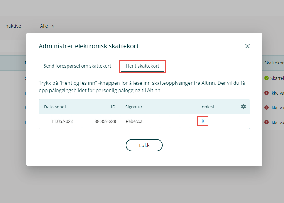 4. Velg fanen Hent skattekort og les inn skattekortet når du har mottatt en returfil fra Altinn. Dersom det står et kryss under kolonnen Innlest er filen lest inn i systemet.