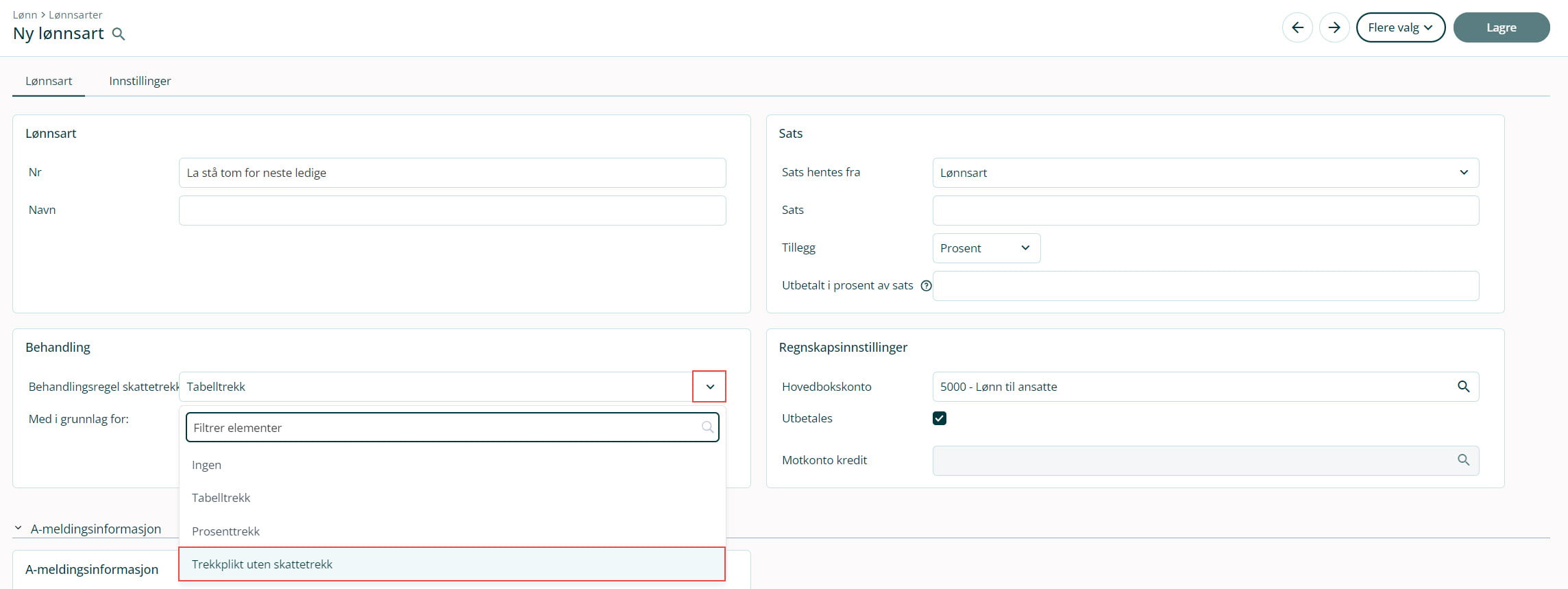 2. Lag en nøyaktig kopi av lønnsarten du bruker, men klikk på pilen for å velge Trekkplikt uten skattetrekk under behandling. På denne måten blir det innberettet som skattepliktig, slik at du unngår negativt skattetrekk på lønnsavregningen. Innberetningen skjer med skattetrekk i A-meldingen.