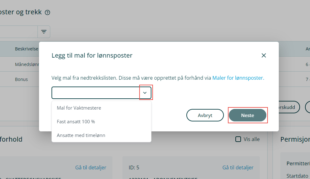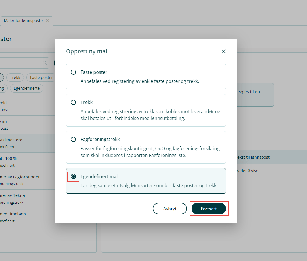 2. Klikk på Flere valg og velg Mal for lønnsposter