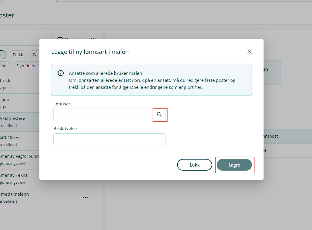 7. Klikk på forstørrelsesglasset for å søke etter lønnsarter. Dersom du legger inn negativt fortegn foran enten sats eller antall vil den trekke fra lønnsgrunnlaget til den ansatte.