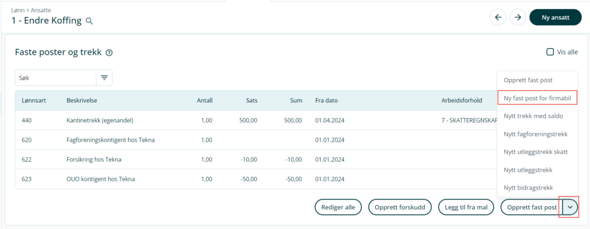 - Konto: Hvilken konto denne fastlønnsposten skal føres mot.