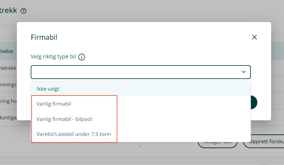 - Arbeidsforhold: Hvilket arbeidsforhold firmabilen skal knyttes opp mot.