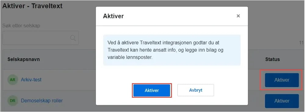 6. Finn det aktuelle selskapet og klikk Aktiver