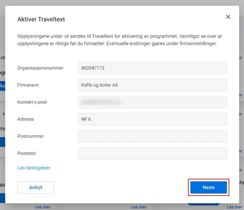 2. Klikk Neste. Informasjonen her er hentet fra Innstillinger: Juridisk enhet. Dersom informasjonen er feil kan vi anbefale deg å endre dette før du aktiverer integrasjonen.