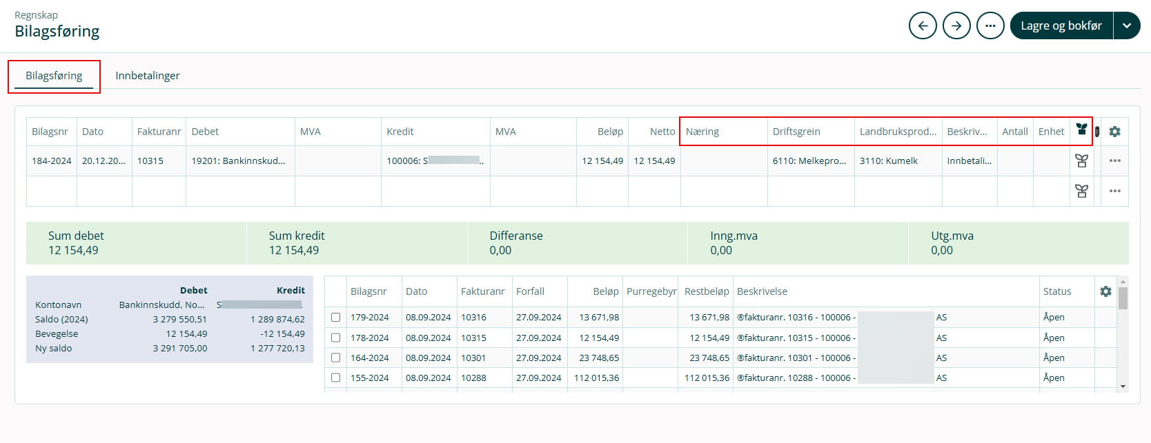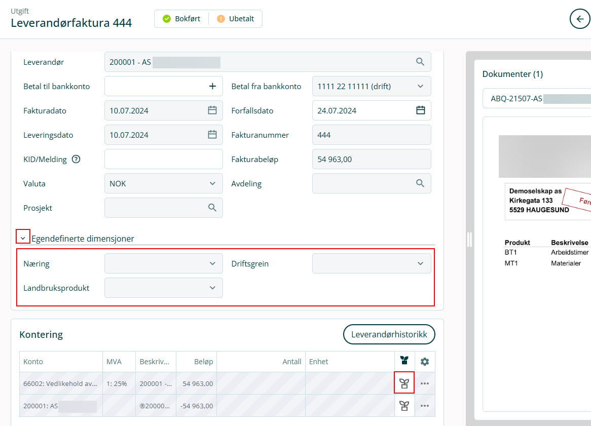 Når utvidelsen Landbruk er aktivert, får selskapet tilgang til flere felter i funksjonene Leverandørfaktura og Bilagsføring.