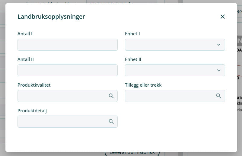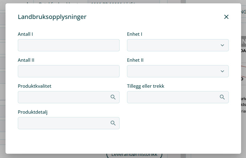 I tillegg finnes det en kolonne med et plantesymbol, og ved å klikke på denne får du opp ytterligere felter: Antall I, Antall II, Enhet I, Enhet II, Produktkvalitet, Produktdetalj og Tillegg eller trekk. Hvis vi tenker at det er lam som selges, kan Antall I f.eks. være 15 (stykk lam), og Antall II kan f.eks. være 400 (pakker med lammekjøtt).